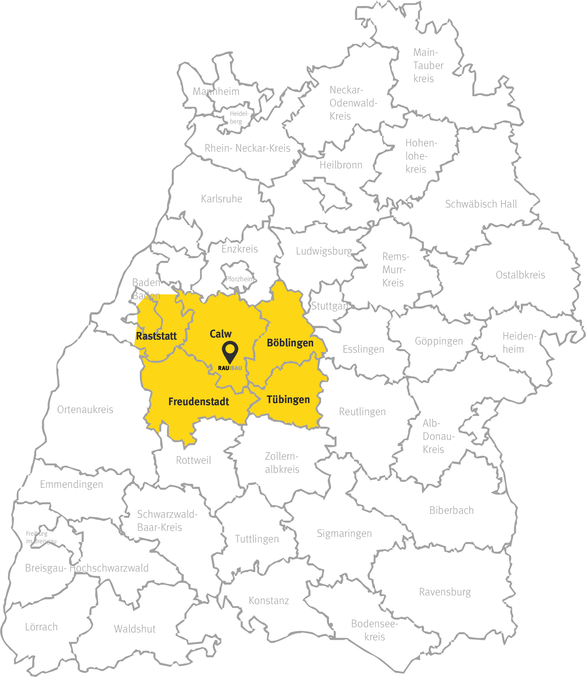 Rau Bau ist in einem großen Gebiet rund um die Landkreise Freudenstadt, Calw, Böblingen und Tübingen tätig. Wir sind stolz darauf, dass wir an vielen verschiedenen Bauprojekten in diesen Regionen mitwirken können. Unsere Baustellen reichen von kleinen Bauvorhaben bis hin zu großen Projekten.ποΈπ οΈ